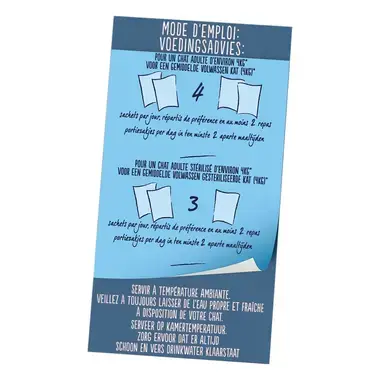 Mode d'emploi pour un chat adulte d'environ 4kg: 3-4 sachets par jour répartis de préférence en au moins 2 repas. Servir à température ambiante. Veillez à toujours laisser de l'eau propre et fraîche à disposition de votre chat. Les rations journalières conseillées pour l'entretien sont calculées pour un chat à l'activité modérée dans des conditions d'environnement et de température normales. Les besoins nutritionnels peuvent varier selon le chat, il faut donc ajuster ces rations de façon à le maintenir à son poids de forme.