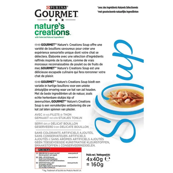 PURINA GOURMET ™ Nature's Creations™ Soep biedt een variatie in hartige bouillons voor een unieke zintuiglijke ervaring waar uw kat van zal houden.|Gemaakt met een selectie van verfijnde ingrediënten, zoals echte herkenbare stukjes kip of vis, PURINA GOURMET ™ Nature's Creations™ Soep is een verrukkelijke eetbeleving die uw kat zal laten spinnen van plezier.